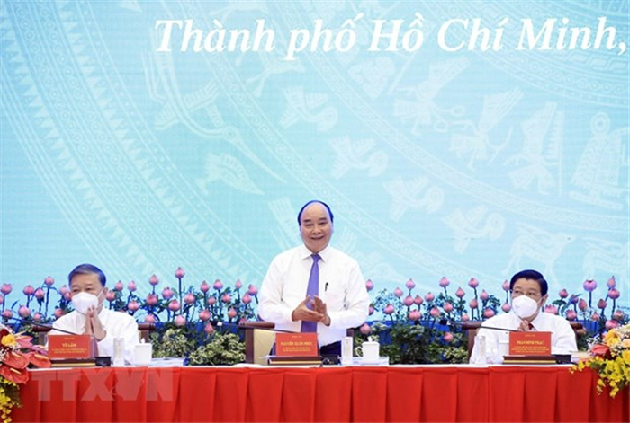Chủ tịch nước Nguyễn Xuân Phúc cùng các lãnh đạo chủ trì hội thảo. (Ảnh: Thống Nhất/TTXVN).