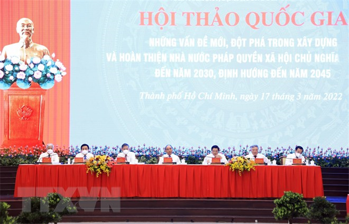 Sáng 17/3, tại thành phố Hồ Chí Minh, Ban Chỉ đạo xây dựng Đề án "Chiến lược xây dựng và hoàn thiện Nhà nước pháp quyền xã hội chủ nghĩa Việt Nam đến năm 2030, định hướng đến năm 2045" tổ chức Hội thảo quốc gia với chủ đề: “Những vấn đề mới, đột phá trong xây dựng và hoàn thiện Nhà nước pháp quyền xã hội chủ nghĩa Việt Nam đến năm 2030, định hướng đến năm 2045.”