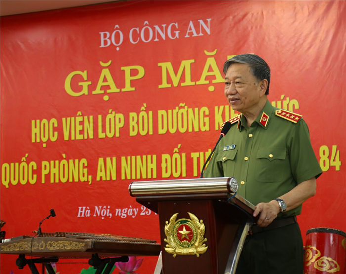 Thay mặt Đảng ủy Công an Trung ương, Bộ Công an, Bộ trưởng Tô Lâm nhiệt liệt chào mừng và chúc sức khỏe các đồng chí lãnh đạo Đảng ủy, Ban Giám đốc Học viện Quốc phòng, lãnh đạo các cơ quan, đơn vị, ban, ngành ở Trung ương và địa phương đang tham dự Lớp bồi dưỡng kiến thức Quốc phòng, An ninh đối tượng 1, Khóa 84 cùng các đại biểu đã đến dự buổi gặp mặt.