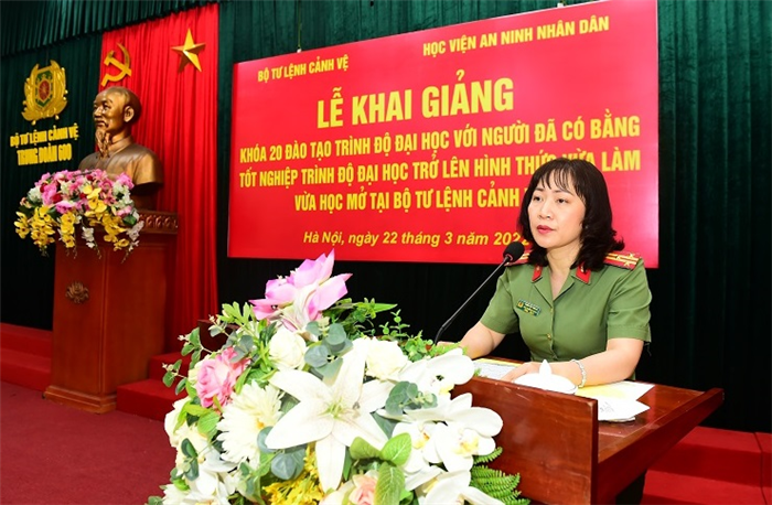 Phát biểu chỉ đạo tại buổi Lễ, thay mặt Đảng ủy, Bam Giám đốc Học viện ANND, Thiếu tướng, PGS.TS Lê Ngọc An - Phó Bí thư Đảng ủy, Phó Giám đốc Học viện nhấn mạnh, xuất phát từ yêu cầu đặc thù của công tác đào tạo, bồi dưỡng trong Công an nhân dân, Học viện đã phối hợp với Cục Đào tạo, Công an các đơn vị, địa phương mở nhiều loại hình đào tạo nhằm tạo trang bị cho đội ngũ cán bộ Công an các đơn vị, địa phương tham gia học tập nâng cao trình độ pháp luật, nghiệp vụ Công an. Đồng thời khẳng định, việc Khai giảng Khóa 20 - đào tạo trình độ đại học đối với người có bằng tốt nghiệp trình độ đại học trở lên mở tại Bộ Tư lệnh Cảnh vệ không chỉ giúp trang bị cho học viên kiến thức về pháp luật và nghiệp vụ an ninh ở trình độ đại học mà còn giúp các học viên sớm hoàn thiện tiêu chuẩn theo các chức danh cán bộ của lực lượng Công an nhân dân.