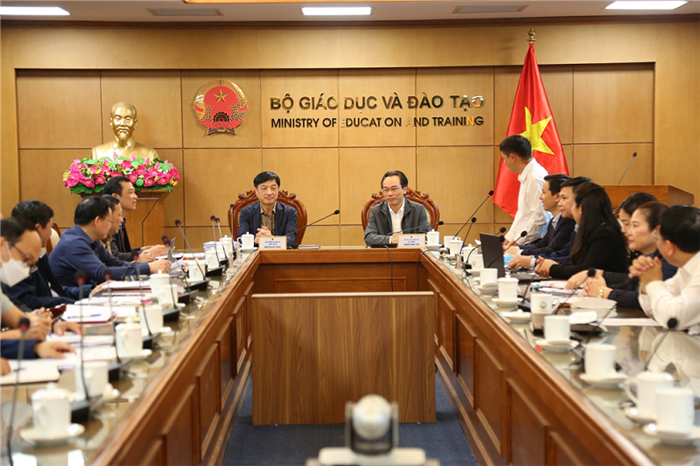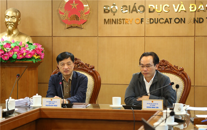 Thứ trưởng Nguyễn Duy Ngọc và Thứ trưởng Bộ GD&ĐT Hoàng Minh Sơn tại cuộc họp. |