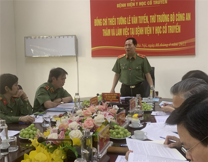 Sáng 8/4 tại Hà Nội, Thiếu tướng Lê Văn Tuyến, Thứ trưởng Bộ Công an chủ trì buổi làm việc với lãnh đạo chủ chốt Bệnh viện Y học cổ truyền Bộ Công an. Tham dự buổi làm việc có đại diện lãnh đạo Văn phòng Bộ Công an và một số đơn vị chức năng.