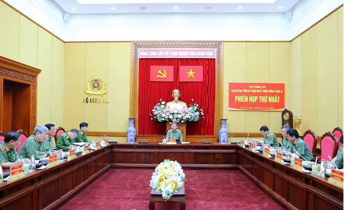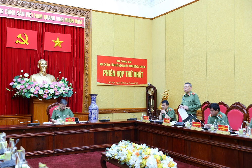 Sáng 18/4/2022, Ban Chỉ đạo tổng kết 10 năm thực hiện Nghị quyết Trung ương 8 khóa XI về Chiến lược bảo vệ Tổ quốc (BVTQ) trong tình hình mới của Bộ Công an tổ chức phiên họp thứ nhất. Đại tướng Tô Lâm, Ủy viên Bộ Chính trị, Bộ trưởng Bộ Công an, Trưởng Ban Chỉ đạo chủ trì phiên họp.