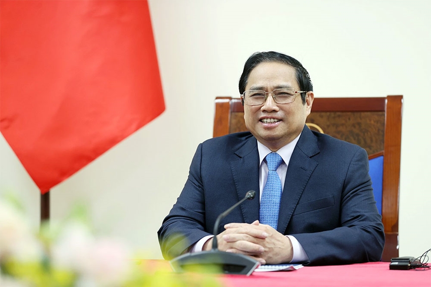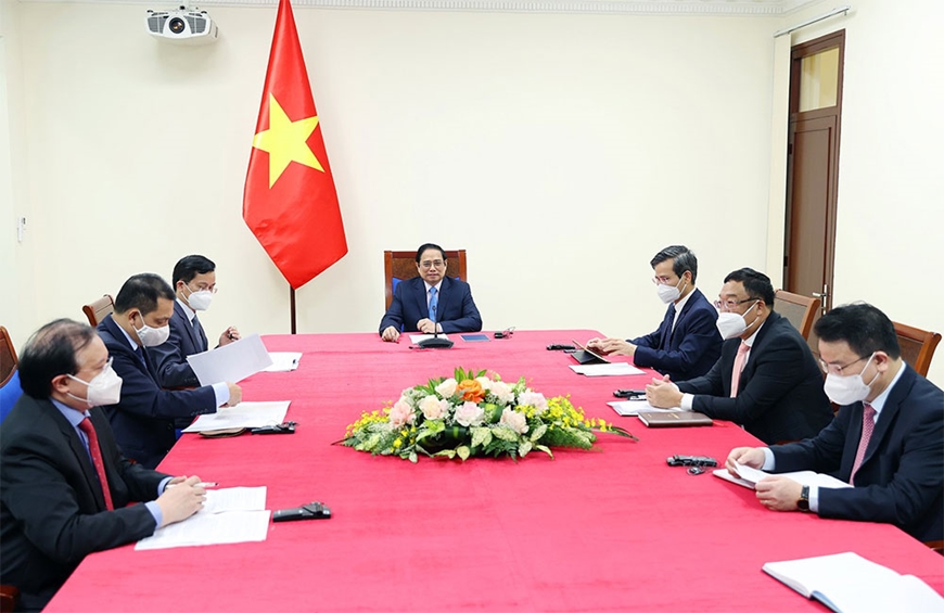 Tại cuộc điện đàm, Thủ tướng Chính phủ Phạm Minh Chính chia sẻ cam kết mạnh mẽ của Việt Nam tại Hội nghị thượng đỉnh COP26 vừa qua về giảm phát thải khí nhà kính, chuyển đổi sang nền kinh tế xanh, tuần hoàn với mục tiêu đạt mức phát thải ròng bằng "0" vào năm 2050.