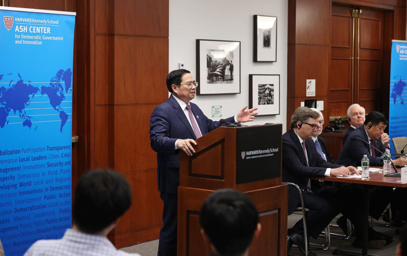 "Tôi đến đây với tình cảm kép, tình cảm của Đại học Harvard dành cho đoàn và tình cảm của mối lương duyên, sự kết nối giữa Việt Nam và Hoa Kỳ. Quan hệ Việt Nam-Hoa Kỳ trải qua những thăng trầm và đột phá, từ khi bắt đầu bình thường hóa quan hệ năm 1995, đã không ngừng phát triển trên tất cả các lĩnh vực. Mối quan hệ toàn diện này vì lợi ích của nhân dân hai nước, vì hòa bình, hợp tác và phát triển trong khu vực và trên thế giới", Thủ tướng nói.