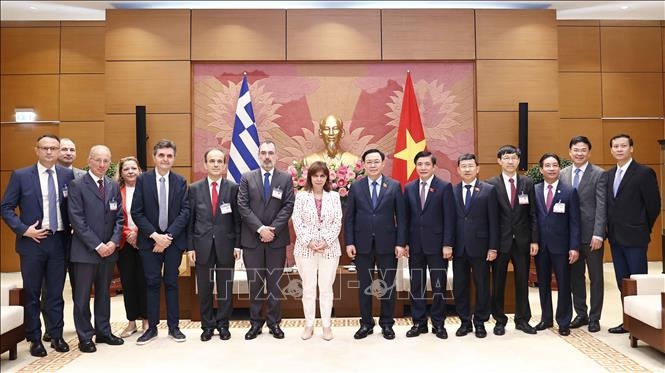Chủ tịch Quốc hội Vương Đình Huệ và Tổng thống Hy Lạp Katerina Sakellaropoulou với các đại biểu. Ảnh: TTXVN |