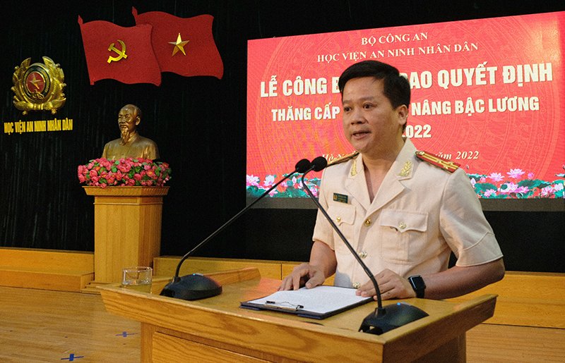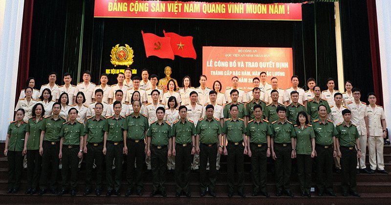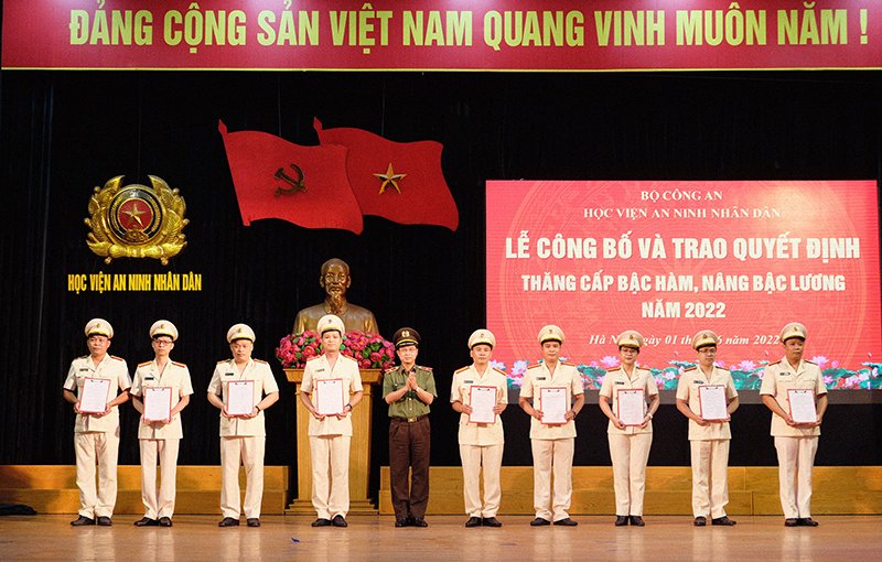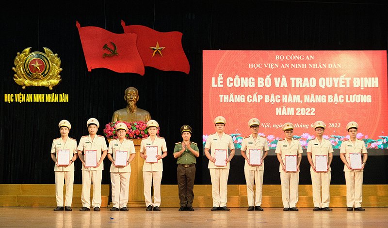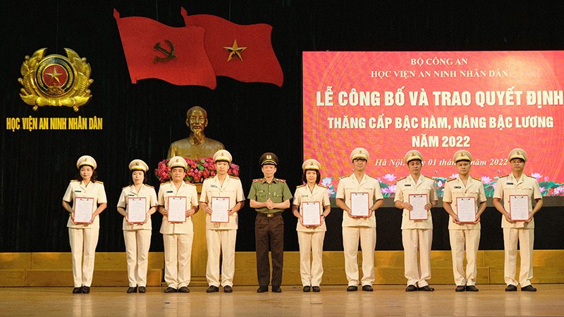 Thực hiện chỉ đạo của Bộ Công an về việc xét đề nghị thăng cấp bậc hàm, nâng lương đối với cán bộ chiến sĩ hàng năm, Học viện An ninh nhân dân đã hoàn thành công tác xét thăng cấp bậc hàm, nâng lương năm 2022 cho cán bộ, giảng viên đến niên hạn.