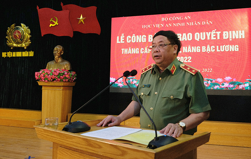 Thay mặt Đảng ủy, Ban Giám đốc Học viện, Trung tướng, PGS.TS Lê Văn Thắng - Bí thư Đảng ủy, Giám đốc Học viện chúc mừng cán bộ, giảng viên được thăng cấp bậc hàm, nâng bậc lương năm 2022. Đồng thời nhấn mạnh, đây là sự quan tâm sâu sắc của Đảng ủy Công an Trung ương, lãnh đạo Bộ Công an, ghi nhận quá trình phấn đấu, rèn luyện, công tác, cống hiến, phục vụ, là niềm vinh dự, tự hào của mỗi cán bộ, chiến sĩ Công an nhân dân.