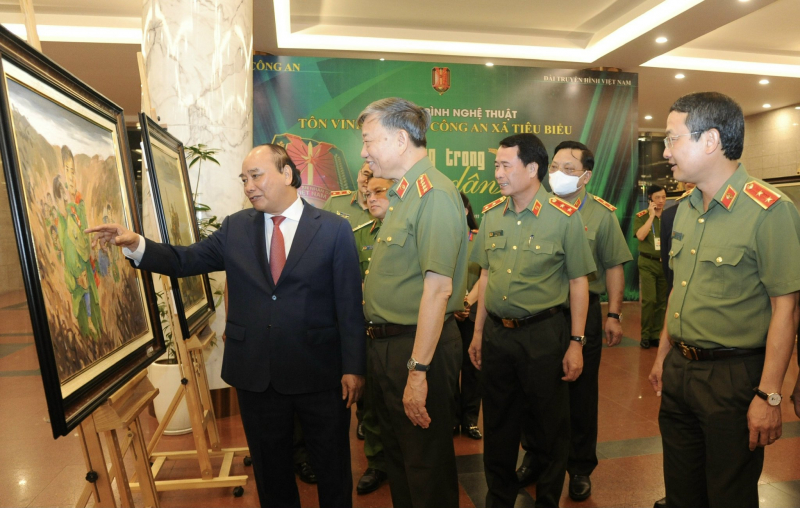Chủ tịch nước Nguyễn Xuân Phúc, Bộ trưởng Tô Lâm cùng các đồng chí lãnh đạo Bộ Công an thăm quan triển lãm tranh về lực lượng Công an xã.