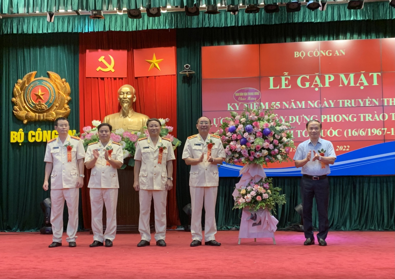 Đại diện Ban Dân vận Trung ương, đồng chí Phạm Tất Thắng trao lẵng hoa chức mừng lực lượng Xây dựng phong trào BVANTQ nhân dịp kỷ niệm 55 năm Ngày truyền thống.