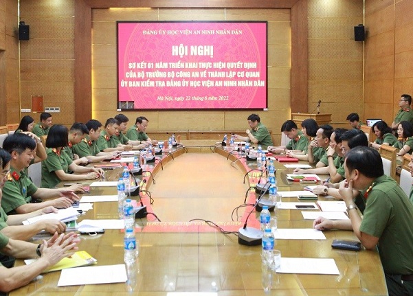 Thực hiện Kế hoạch số 120-KH/ĐUCA, ngày 25/5/2022 của Ban Thường vụ Đảng ủy Công an Trung ương (CATW) về sơ kết 01 năm triển khai thực hiện Quyết định của Bộ trưởng Bộ Công an thành lập Cơ quan Ủy ban kiểm tra (UBKT) các cấp trong Công an nhân dân, chiều 22/6/2022, Đảng ủy Học viện An ninh nhân dân (ANND) đã tổ chức Hội nghị sơ kết 01 năm triển khai thực hiện Quyết định của Bộ trưởng Bộ Công an về thành lập Cơ quan UBKT Đảng ủy Học viện ANND.
