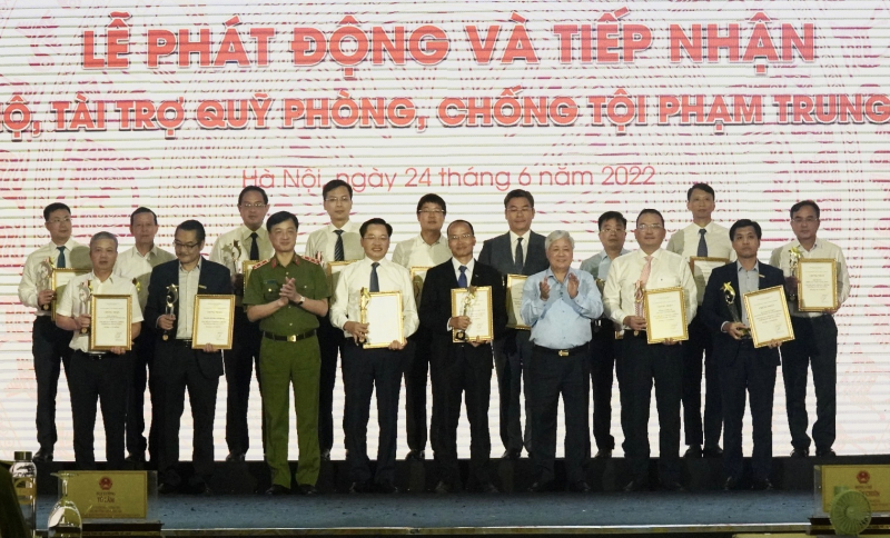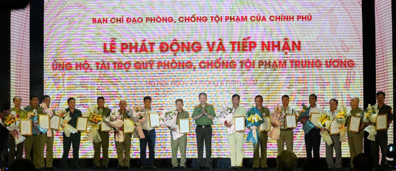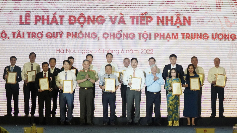 Thay mặt cho Quỹ PCTP Trung ương, Bộ trưởng Tô Lâm và các đại biểu đã trao giấy chứng nhận và kỷ niệm chương tặng đại diện các cơ quan, đơn vị, tổ chức, cá nhân đã ủng hộ cho Quỹ PCTP Trung ương ngay tại Lễ phát động.
