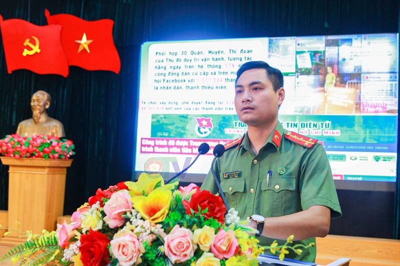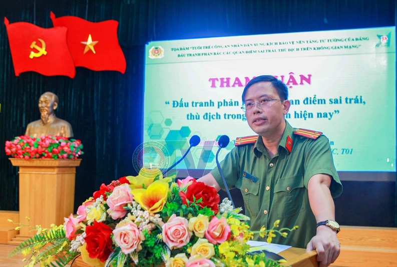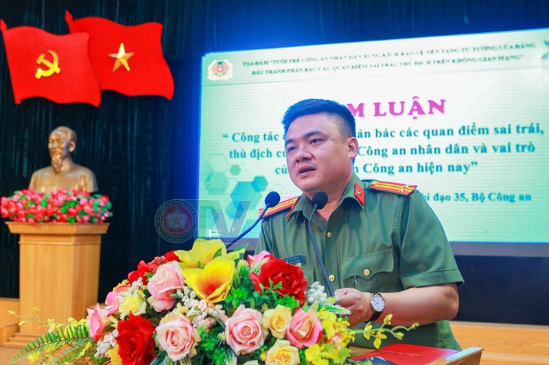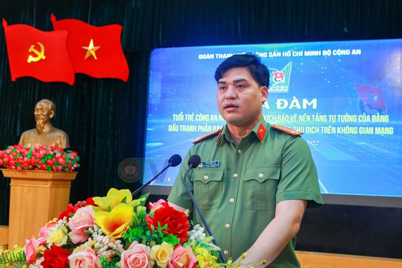 Trung tá Đồng Đức Vũ, Ủy viên Ban Thường vụ Trung ương Đoàn, Bí thư Đoàn Thanh niên Bộ Công an phát biểu tại buổi Tọa đàm