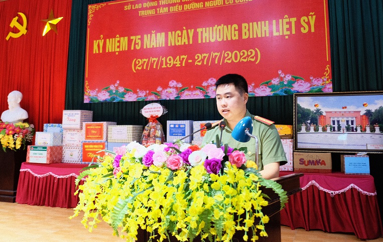 Được sự ủy quyền của Đảng ủy, Ban Giám đốc Học viện ANND, phát biểu tại buổi tặng quà, Thiếu tá, TS Nghiêm Xuân Dũng – Phó Chánh Văn phòng Học viện ANND đã gửi tới các đồng chí thương, bệnh binh và những người có công đang sinh hoạt tại Trung tâm Điều dưỡng lời chúc sức khỏe, lòng biết ơn trước sự hy sinh, mất mát của thế hệ đi trước.