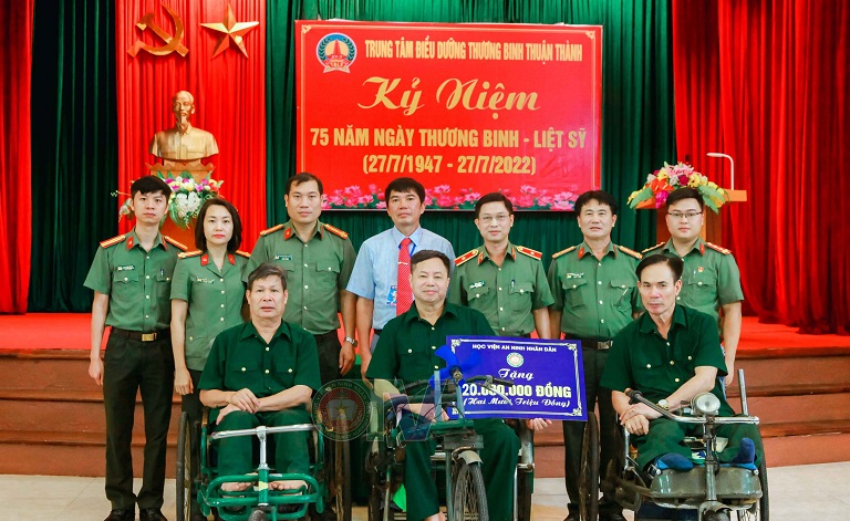 Với các hoạt động “Đền ơn đáp nghĩa”, Đoàn Học viện ANND đã đến thăm hỏi, động viên các thương bệnh binh tại Trung tâm điều dưỡng thương binh huyện Thuận Thành, tỉnh Bắc Ninh và huyện Duy Tiên, tỉnh Hà Nam, tặng mỗi Trung tâm phần quà là 20 triệu đồng.