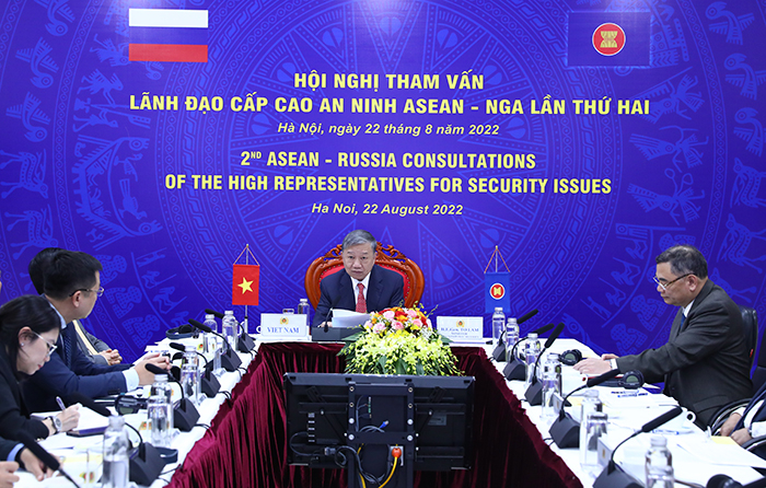 Chiều 22/8, Đoàn đại biểu cấp cao Việt Nam do Đại tướng Tô Lâm, Uỷ viên Bộ Chính trị, Bộ trưởng Bộ Công an làm Trưởng đoàn đã tham dự Hội nghị tham vấn lãnh đạo cấp cao an ninh Hiệp hội các quốc gia Đông Nam Á (ASEAN) - Nga lần thứ hai diễn ra theo hình thức trực tuyến.