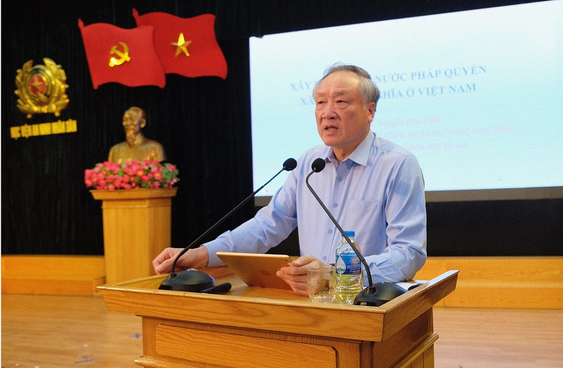 Đồng chí PGS.TS Nguyễn Hòa Bình, Chánh án Tòa án nhân dân tối cao giảng bài tại Học viện An ninh nhân dân