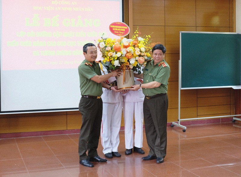 Trung tướng, Nguyễn Ngọc Toàn, Viện trưởng Viện Khoa học và công nghệ, Bộ Công an – đại diện học viên lớp học tặng lẵng hoa thay lời tri ân tới Đảng uỷ, Ban Giám đốc Học viện, các thầy, cô giáo tại Lễ Bế giảng.