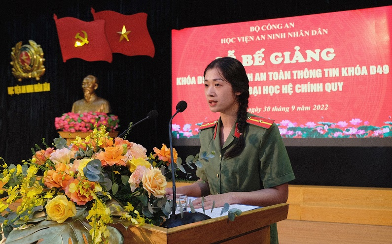 Thiếu úy Phạm Thanh Hằng, đại diện cho các tân sỹ quan an ninh đã trân trọng gửi lời cảm ơn sâu sắc đến Đảng ủy, Ban Giám đốc Học viện, các thầy, cô giáo, các đơn vị chức năng trong và ngoài Học viện đã quan tâm, tạo mọi điều kiện để Khóa học thành công tốt đẹp và xin hứa sau khi trở về đơn vị sẽ tích cực học hỏi, trau dồi kiến thức để nâng cao trình độ chuyên môn, áp dụng có hiệu quả kiến thức đã được học vào thực tiễn công tác.