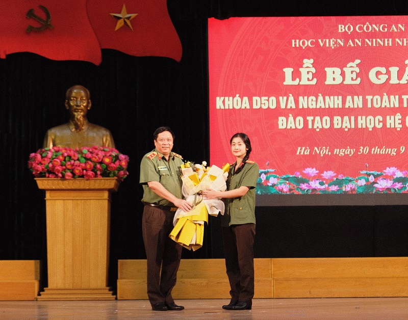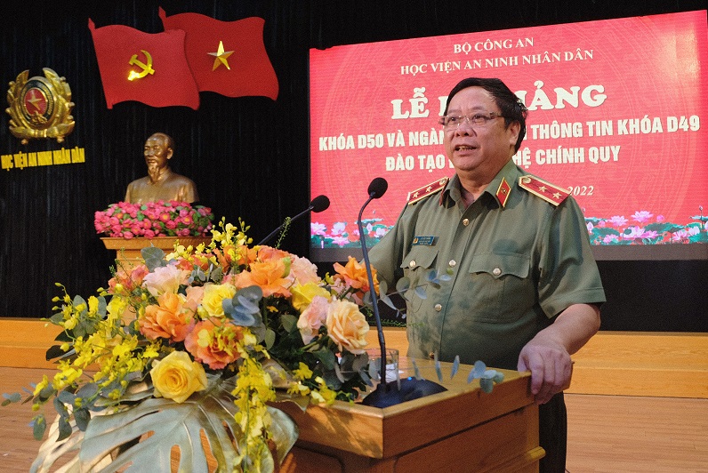 Phát biểu tại buổi Lễ, Trung tướng Lê Văn Thắng - Giám đốc Học viện ANND ghi nhận, biểu dương và chúc mừng những thành tích đã đạt được trong học tập và rèn luyện của học viên Khóa D50 và Khóa D49 ngành ATTT. Đồng chí Giám đốc Học viện căn dặn tới các tân sĩ quan an ninh sau khi được phân công, điều động về nhận công tác tại các đơn vị, địa phương cần tiếp tục học tập, rèn luyện, tu dưỡng phẩm chất chính trị, đạo đức cách mạng, lối sống và năng lực chuyên môn; thấm nhuần sâu sắc 6 điều Bác Hồ dạy Công an nhân dân, chống mọi biểu hiện suy thoái về đạo đức, lối sống và các hiện tượng tiêu cực khác; tiếp tục nghiên cứu, vận dụng một cách sáng tạo những kiến thức đã học vào thực tiễn công tác chiến đấu. Đồng thời, qua thực tiễn công tác luôn không ngừng bổ sung kiến thức để hoàn thiện lý luận, tích lũy kinh nghiệm thực tiễn, nâng cao năng lực công tác của bản thân để hoàn thành tốt nhiệm vụ được giao.