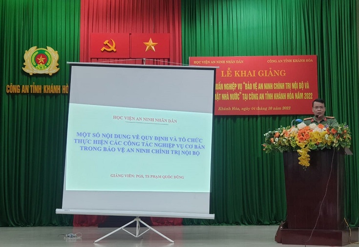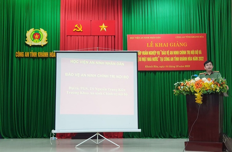 Thực hiện Quyết định số: 6333/QĐ-T01-NV4 ngày 30/9/2022 của Giám đốc Học viện An ninh nhân dân (ANND), ngày 03 và 04/10/2022, tại tỉnh Khánh Hòa, Học viện ANND đã phối hợp với Công an tỉnh tổ chức Hội nghị tập huấn “Công tác bảo vệ bí mật nhà nước” và Khai giảng Lớp tập huấn nghiệp vụ “Bảo vệ an ninh chính trị nội bộ và bảo vệ bí mật nhà nước” năm 2022.