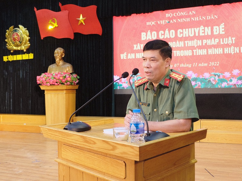 Đại tá, PGS.TS Trần Nguyên Quân - Phó Cục trưởng Cục Pháp chế và cải cách hành chính, tư pháp Bộ Công an báo cáo chuyên đề pháp luật.