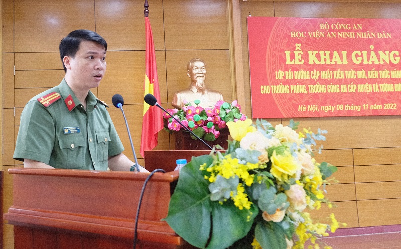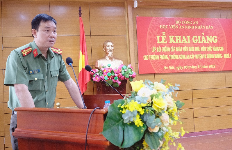 Trong diễn văn Khai giảng, thay mặt Đảng ủy, Ban Giám đốc Học viện, Thiếu tướng, TS Trần Kim Hải - Phó Giám đốc Học viện nhấn mạnh, sinh thời, Chủ tịch Hồ Chí Minh căn dặn “Cán bộ là cái gốc của mọi công việc”, “công việc thành công hoặc thất bại đều do cán bộ tốt hay kém”. Vận dụng sâu sắc tư tưởng của Người, Đảng và Nhà nước ta luôn xác định công tác đào tạo và bồi dưỡng cán bộ là nhiệm vụ trọng yếu, thường xuyên, góp phần thực hiện thành công sự nghiệp công nghiệp hóa, hiện đại hóa đất nước. Quán triệt quan điểm đó, Đảng ủy Công an Trung ương và lãnh đạo Bộ Công an chỉ đạo tiếp tục đẩy mạnh công tác đào tạo, bồi dưỡng cán bộ trong đó có bồi dưỡng cập nhật kiến thức mới, kiến thức nâng cao cho Trưởng phòng, Trưởng Công an cấp huyện và tương đương.