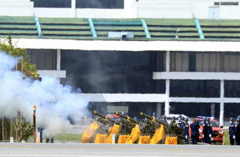 Chính phủ Thái Lan tổ chức nghi thức bắn đại bác chào đón Chủ tịch nước Nguyễn Xuân Phúc và Phu nhân sang thăm chính thức Vương quốc Thái Lan tại Sân bay Không quân Hoàng gia - Ảnh: TTXVN