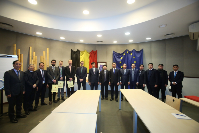Thứ trưởng Nguyễn Duy Ngọc cùng đoàn công tác chụp ảnh lưu niệm với các lãnh đạo và chuyên gia chuyển đổi số Vương quốc Bỉ.