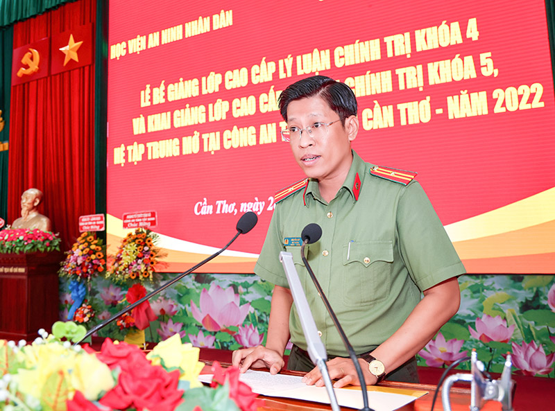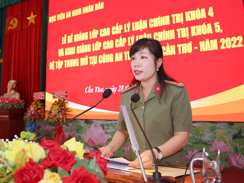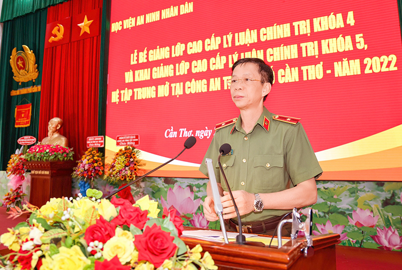 Thay mặt Đảng ủy, Ban Giám đốc Học viện, Thiếu tướng, TS Trần Kim Hải - Phó Giám đốc Học viện chúc mừng các học viên lớp đào tạo Cao cấp LLCT trị hệ tập trung Khóa 4. Sau thời gian 08 tháng học tập, lớp Cao cấp LLCT Khóa 4 hệ tập trung mở tại CATP Cần Thơ đã hoàn thành chương trình đào tạo. Trong quá trình đào tạo, học viên được trang bị kiến thức của 19 môn học và chương trình ngoại khóa. Bên cạnh nghiên cứu, học tập các chuyên đề theo khung chương trình đào tạo Cao cấp LLCT của Học viện Chính trị Quốc gia Hồ Chí Minh, học viên còn được trang bị bổ sung các chuyên đề đặc thù của lực lượng Công an. Khoá học diễn ra trong bối cảnh tình hình dịch bệnh Covid-19 diễn biến phức tạp, tuy nhiên với sự cố gắng, nỗ lực, Ban tổ chức Khóa học và các học viên đã khắc phục khó khăn để hoàn thành xuất sắc nhiệm vụ.