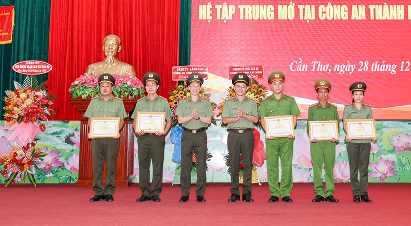 Tại buổi Lễ, Thiếu tướng, TS Trần Kim Hải - Phó Giám đốc Học viện và Đại tá, Trần Văn Dương - Phó Giám đốc CATP Cần Thơ đã trao Bằng tốt nghiệp và Giấy khen cho các học viên đạt thành tích xuất sắc.