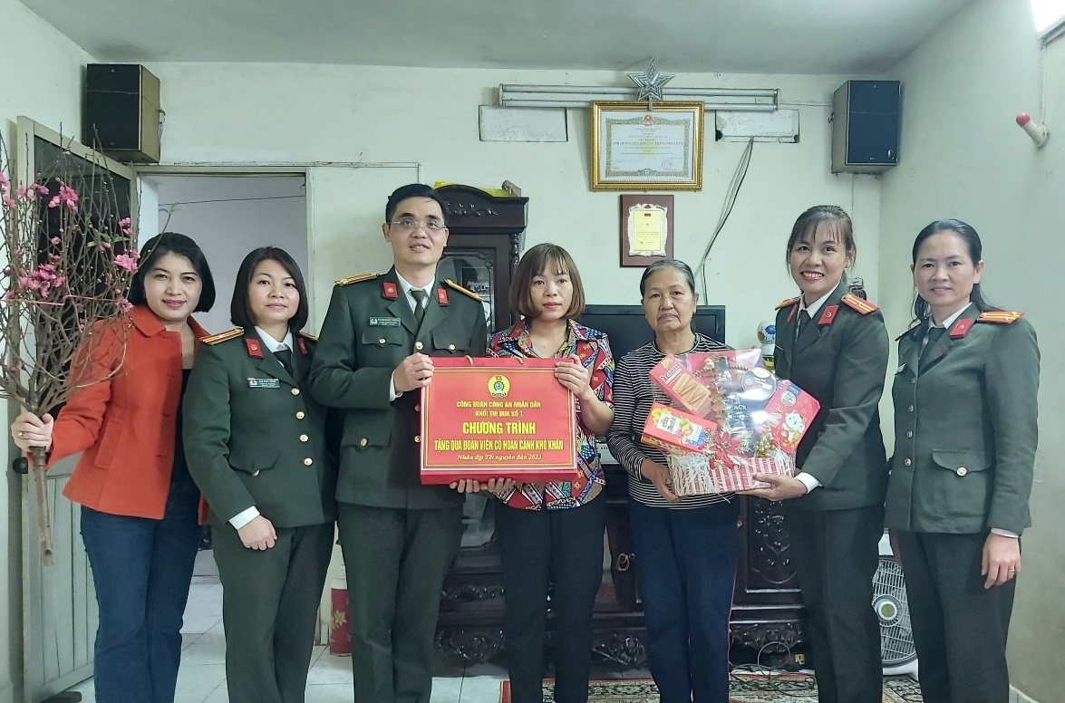 Đoàn đã đến thăm hỏi, tặng quà cho gia đình chị Bùi Thị Vọng, là lao động hợp đồng thuộc công đoàn cơ sở Phòng Hậu cần - Học viện ANND có hoàn cảnh đặc biệt khó khăn. Tại buổi gặp mặt, lãnh đạo Công đoàn CAND và Học viện ANND đã thăm hỏi, chúc sức khỏe đến gia đình và mong muốn chị Bùi Thị Vọng vượt qua khó khăn, hoàn thành tốt nhiệm vụ, đón một cái Tết vui tươi, đầm ấm. Cùng sẻ chia với những khó khăn, Đoàn đã trao tặng cho gia đình chị Bùi Thị Vọng phần quà là 01 xe đạp, 01 giá sách phục vụ học tập cho các cháu, bánh kẹo, nhu yếu phẩm ngày Tết và tiền mặt với tổng trị giá các phần quà là 08 triệu đồng. Chị Vọng và gia đình đã rất xúc động trước tình cảm, sự giúp đỡ, động viên của Công đoàn CAND nói chung và của Công đoàn Học viện ANND nói riêng.