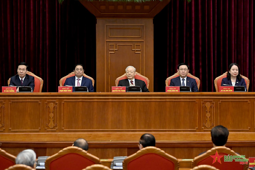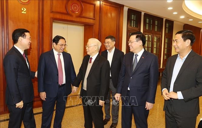 Tổng Bí thư Nguyễn Phú Trọng, Thủ tướng Phạm Minh Chính, Chủ tịch Quốc hội Vương Đình Huệ, Thường trực Ban Bí thư Võ Văn Thưởng và Quyền Chủ tịch nước Võ Thị Ánh Xuân chủ trì hội nghị. |