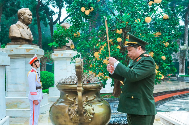 Trung tướng, PGS.TS Lê Văn Thắng - Bí thư Đảng ủy, Giám đốc Học viện dâng hương, dâng hoa trước tượng đài Chủ tịch Hồ Chí Minh và các cố Bộ trưởng Bộ Nội vụ, cố Bộ trưởng Bộ Công an.