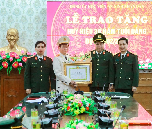 Thay mặt Đảng ủy Học viện An ninh nhân dân, đồng chí Trung tướng, PGS.TS Lê Văn Thắng đã trao Huy hiệu 30 năm tuổi Đảng và tặng hoa chúc mừng đồng chí Thượng tá Kiều Tiến Hùng.