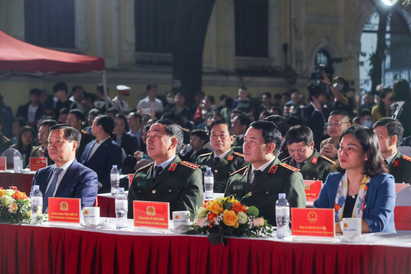 Các đồng chí lãnh đạo Đảng, Nhà nước, Bộ Công an, TP Hà Nội cùng các đại biểu, khán giả theo dõi chương trình.