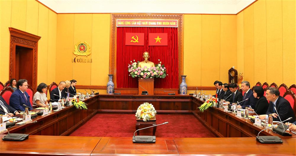 Phát biểu tại buổi làm việc, Bộ trưởng Tô Lâm nhấn mạnh, chuyến thăm và làm việc của Đoàn USTR với Bộ Công an Việt Nam thể hiện thiện chí hợp tác và cam kết của Hoa Kỳ trong thảo luận, giải quyết các vấn đề về thương mại mà hai Bên cùng quan tâm và duy trì, thúc đẩy quan hệ hợp tác song phương Việt Nam – Hoa Kỳ nói chung, quan hệ hợp tác kinh tế - thương mại nói riêng hướng tới kỷ niệm 10 năm thiết lập Quan hệ đối tác toàn diện Việt Nam – Hoa Kỳ trong năm nay.