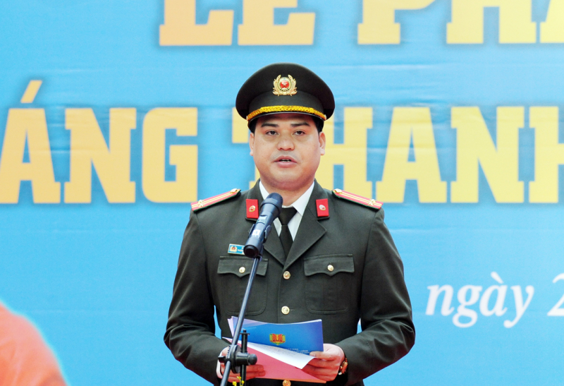 Trung tá Đồng Đức Vũ, Trưởng Ban Thanh niên CAND phát động Tháng Thanh niên năm 2023 và các hoạt động hưởng ứng phong trào thi đua đặc biệt kỷ niệm 75 năm Ngày Chủ tịch Hồ Chí Minh nêu Sáu điều dạy CAND.