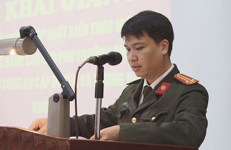 Thượng tá Nguyễn Đại Dũng, Phó trưởng Công an huyện Thanh Trì - Công an thành phố Hà Nội, đại diện cho học viên Khóa học phát biểu cảm tưởng tại Lễ Khai giảng.