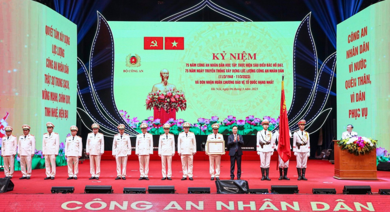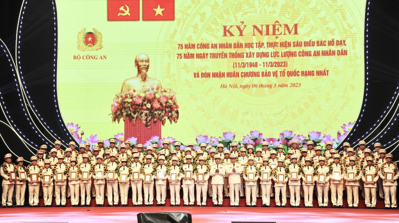 Buổi kỷ niệm 75 năm "CAND học tập, thực hiện Sáu điều Bác Hồ dạy"; 75 năm Ngày truyền thống Xây dựng lực lượng CAND (11/3/1948 - 11/3/2023) và đón nhận Huân chương Bảo vệ Tổ quốc hạng Nhất được Đảng ủy Công an Trung ương, Bộ Công an tổ chức trọng thể tại Thủ đô Hà Nội, sáng 6/3, với sự tham dự của Tổng Bí thư Nguyễn Phú Trọng và đồng chí Võ Văn Thưởng, Uỷ viên Bộ Chính trị, Chủ tịch nước, Thường trực Ban Bí thư. Đại tướng Tô Lâm, Uỷ viên Bộ Chính trị, Bí thư Đảng uỷ Công an Trung ương, Bộ trưởng Bộ Công an chủ trì buổi kỷ niệm.