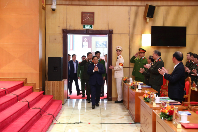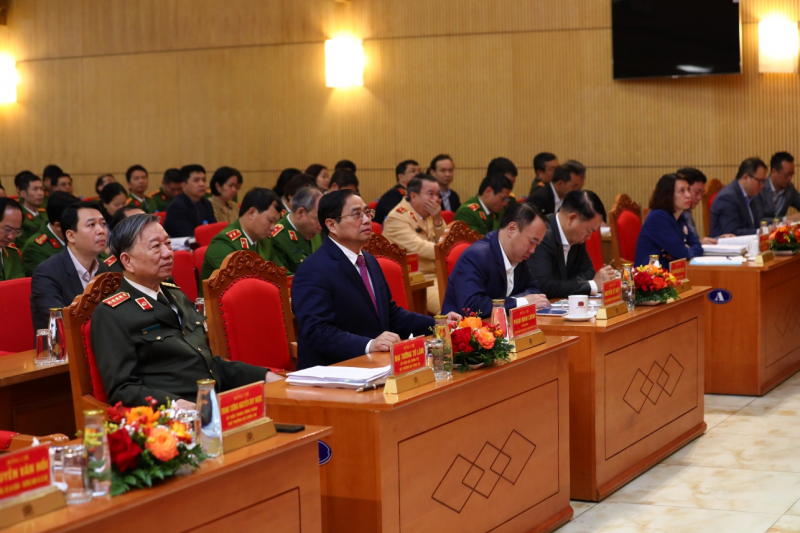 Thủ tướng Chính phủ Phạm Minh Chính và Bộ trưởng Tô Lâm cùng các đại biểu tham dự hội nghị tại điểm cầu hội trường Bộ Công an.