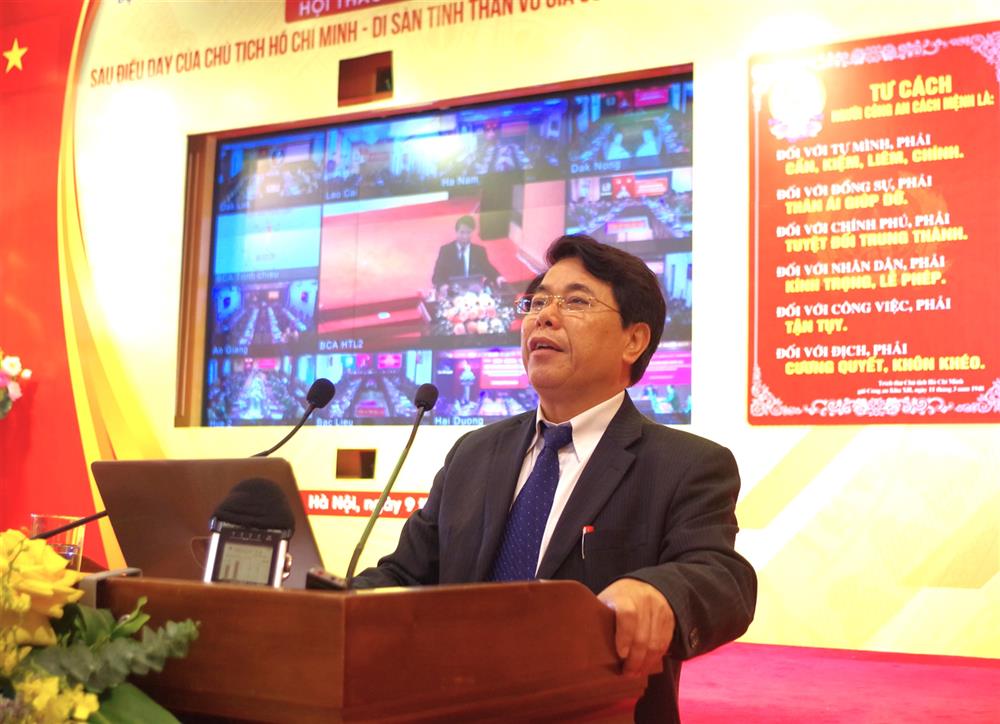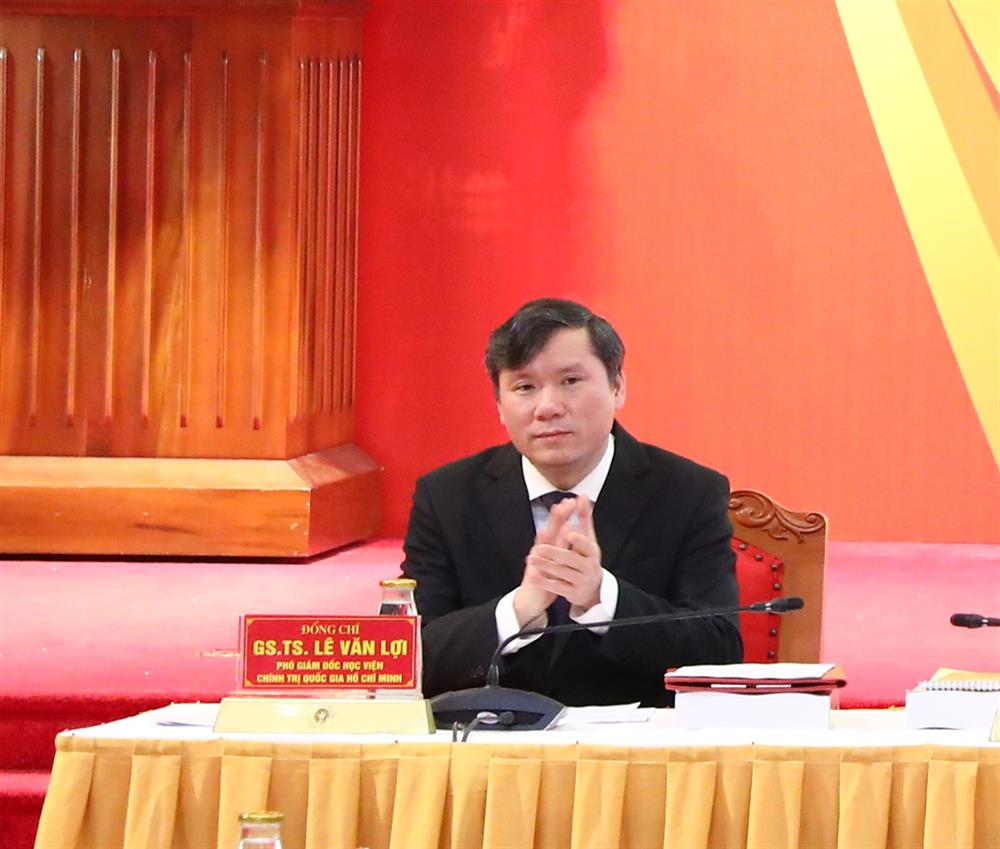 GS.TS Lê Văn Lợi, Phó Giám đốc Học viện Chính trị quốc gia Hồ Chí Minh điều hành tham luận tại Hội thảo. |