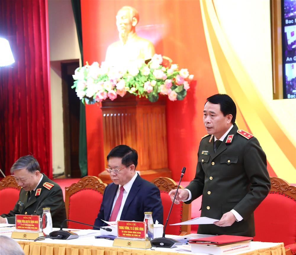 Các đồng chí: Đại tướng, GS.TS Tô Lâm, Ủy viên Bộ Chính trị, Bộ trưởng Bộ Công an; GS.TS Nguyễn Xuân Thắng, Ủy viên Bộ Chính trị, Giám đốc Học viện Chính trị quốc gia Hồ Chí Minh, Chủ tịch Hội đồng Lý luận Trung ương; Nguyễn Trọng Nghĩa, Bí thư Trung ương Đảng, Trưởng Ban Tuyên giáo Trung ương; Trung tướng, TS Lê Quốc Hùng, Ủy viên Trung ương Đảng, Thứ trưởng Bộ Công an - đồng chủ trì Hội thảo.