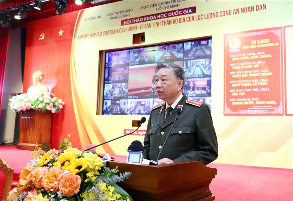 Phát biểu tổng kết Hội thảo, Bộ trưởng Tô Lâm nhấn mạnh, lực lượng CAND trưởng thành, lớn mạnh như ngày hôm nay, những chiến công, thành tích của lực lượng CAND đạt được trong gần 80 năm qua luôn có sự soi đường, chỉ dẫn, động viên, khích lệ, nhắc nhở của Chủ tịch Hồ Chí Minh mà cốt lõi, hạt nhân chính là Sáu lời dạy về tư cách người Công an cách mạng. Lực lượng CAND luôn tự hào và biết ơn Chủ tịch Hồ Chí Minh vĩ đại - người thầy, người cha kính yêu đã giành cho lực lượng CAND những tình cảm quý báu, những lời dạy dỗ ân cần, sự quan tâm sâu sắc để xây dựng lực lượng CAND trở thành lực lượng vũ trang trọng yếu, tuyệt đối trung thành, tin cậy, trong sạch, vững mạnh, làm nòng cốt trong công tác bảo vệ an ninh quốc gia, bảo đảm, trật tự an toàn xã hội.