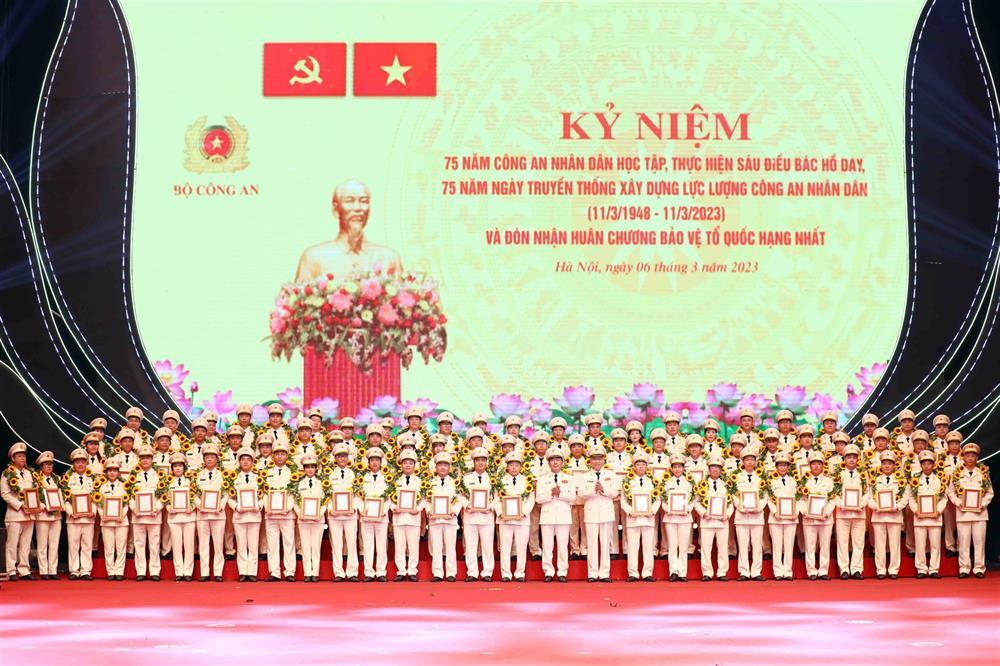 Bộ trưởng Tô Lâm và Thứ trưởng Trần Quốc Tỏ trao thưởng, tuyên dương 75 gương điển hình tiên tiến trong học tập, thực hiện Sáu điều Bác Hồ dạy. (ngày 06/3/2023). |
