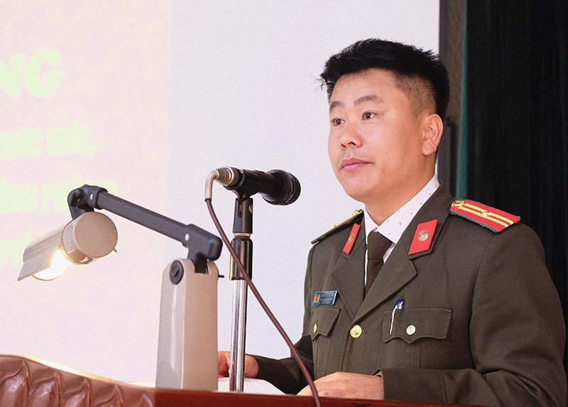 Thiếu tá Thân Việt Cường - Phó Trưởng phòng PA04, Công an tỉnh Lai Châu, đại diện cho học viên Khóa học phát biểu cảm tưởng tại Lễ Bế giảng.