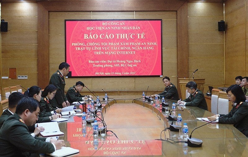 Thực hiện chương trình công tác năm học 2022 - 2023, ngày 13/3/2023, Học viện An ninh nhân dân tổ chức báo cáo chuyên đề “Phòng, chống tội phạm xâm phạm an ninh, trật tự lĩnh vực tài chính, ngân hàng trên mạng Internet” do Đại tá Hoàng Ngọc Bách - Trưởng phòng 4, Cục An ninh mạng và phòng, chống tội phạm sử dụng công nghệ cao Bộ Công an trình bày.