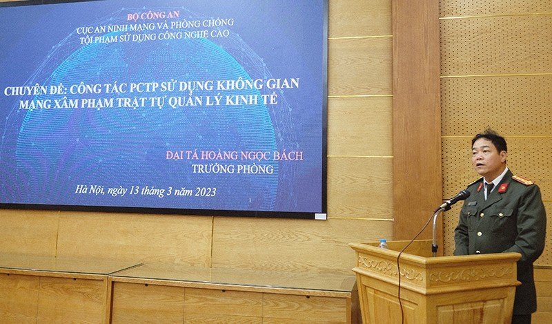 Đại tá Hoàng Ngọc Bách - Trưởng phòng 4, Cục An ninh mạng và phòng, chống tội phạm sử dụng công nghệ cao Bộ Công an báo cáo chuyên đề.