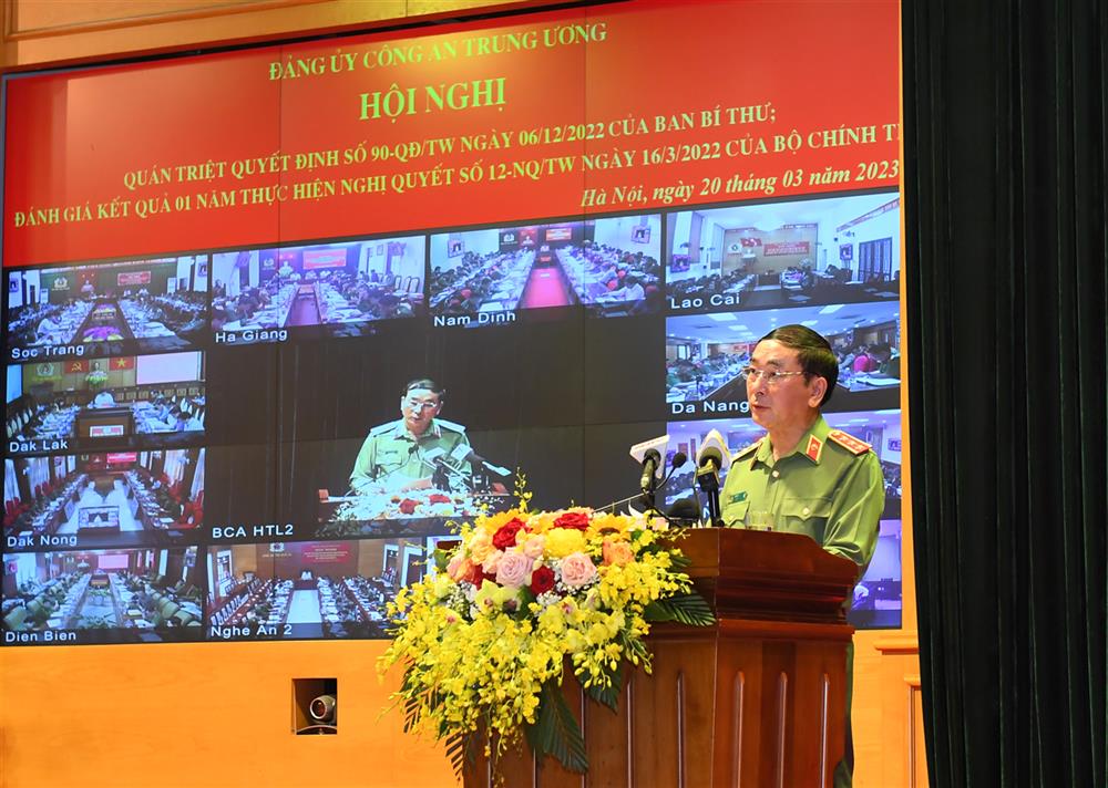 Ngày 20/3/2023, tại Hà Nội, Đảng ủy Công an Trung ương phối hợp Văn phòng Trung ương Đảng tổ chức Hội nghị quán triệt Quyết định số 90-QĐ/TW ngày 06/12/2022 của Ban Bí thư; Đánh giá kết quả 01 năm thực hiện Nghị quyết số 12-NQ/TW ngày 16/3/2022 của Bộ Chính trị. Đồng chí Trương Thị Mai, Ủy viên Bộ Chính trị, Thường trực Ban Bí thư Trung ương Đảng, Trưởng Ban Tổ chức Trung ương dự và chỉ đạo Hội nghị. Đại tướng Tô Lâm, Ủy viên Bộ Chính trị, Bí thư Đảng ủy Công an Trung ương, Bộ trưởng Bộ Công an chủ trì Hội nghị.