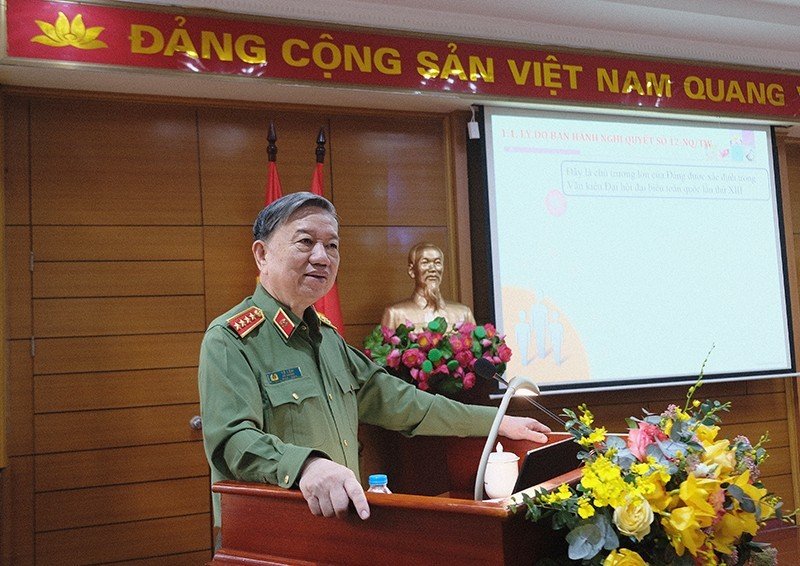 Đại tướng, GS.TS Tô Lâm - Ủy viên Bộ Chính trị, Bí thư Đảng ủy Công an Trung ương, Bộ trưởng Bộ Công an truyền đạt nội dung chuyên đề tại lớp Bồi dưỡng.